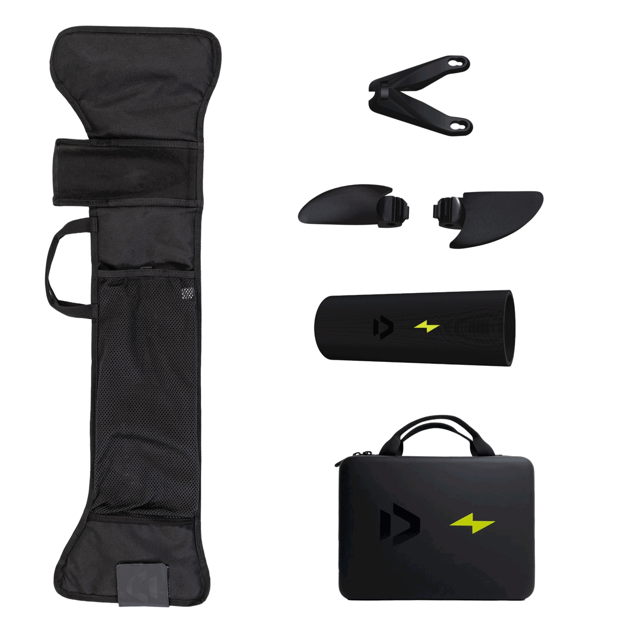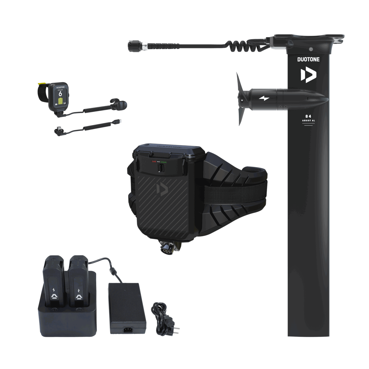 The Foil Assist Set AL includes the following items:eMast AL SetBuilt from lightweight aluminum and measuring 84 cm, the eMast AL is incredibly stiff and provides a direct feel.The motor pod is fully integrated into the mast and positioned slightly behind the leading edge, 17 cm below the top plate, to minimize drag even during touchdowns. It features a two-blade folding propeller that reduces drag for effortless glide on the wave. Thanks to the integrated gear system, the propeller unfolds instantly, providing a smooth transition as you kick out of the wave and power back out.The eMast mounts to your board just like a conventional foil mast.Note: A fuselage adapter is required to mount a fuselage onto the eMast. In addition to the Duotone adapter, we offer ten other options to help you combine the Foil Assist with your existing foil setup. The adapter is not included and must be purchased separately.Tip: For optimal battery performance, pair the eMast with a front wing of at least 900 cm² and a board with a minimum volume of 35 L.eHarness SetThe Foil Assist is powered by two compact batteries housed in a waterproof box mounted on a lightweight eHarness (approx. 3.76 kg). This keeps your board free from extra weight and drag. With the batteries placed on your hips, the natural, fluid feel of foiling is preserved while still giving you full freedom of movement. The eHarness is buoyant and easy to remove. A cable runs neatly along the shorter board leash and connects the batteries to the eMast. The receiver integrated into the battery box ensures a stable and reliable connection between the remote and the motor throughout your entire session.eRemote Watch Ring SetThe Foil Assist Remote - a waterproof smartwatch-style controller with a finger ring - keeps your hands free, making it easier to push up on the board, paddle, duck dive, carve or handle a wing. Activate the motor with a double-click on the + button, and control the speed by pressing and holding either the + or - button.Battery Charger SetThe charger can fully charge both batteries in under one hour and also includes a discharge function that helps maintain long-term battery health.Airtravel-friendly Battery SetDepending on your skill level, setup and the conditions, the Foil Assist batteries provide 30 to 60 minutes of runtime per charge.Note: Find out more details about each product by clicking on the related products below.