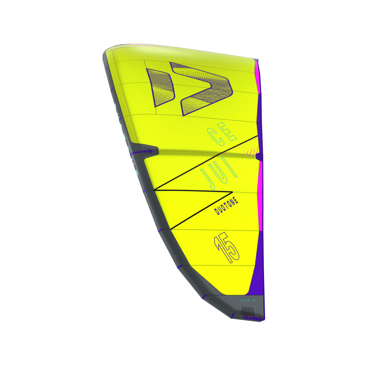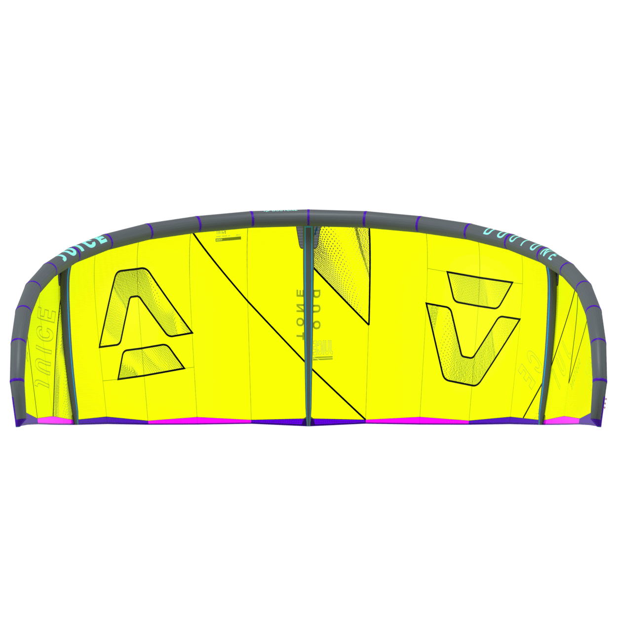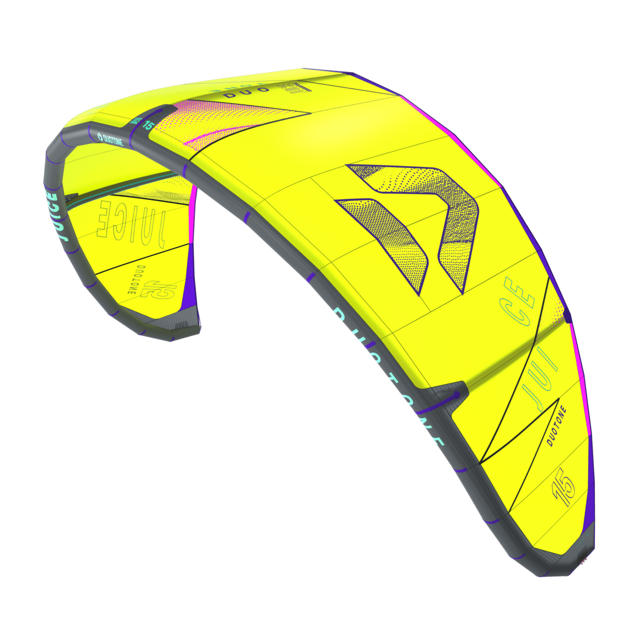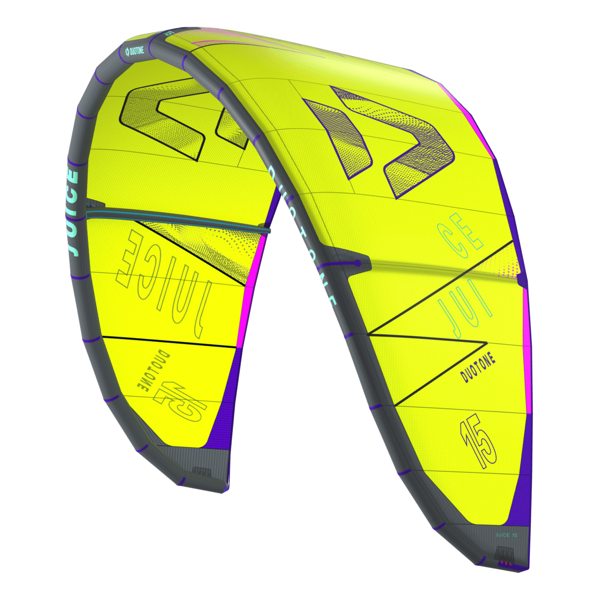 The Duotone Juice offers exceptional lightwind performance through its lightweight construction and meticulous design. Its optimized canopy shape ensures smooth power delivery, allowing you to harness the wind efficiently and start planing early, no matter if on a twintip, a foil or even a surfboard. With top-tier low-end performance, the Juice keeps you riding when others are stranded on the beach. The new design of the Juice sets it apart from its predecessors, boasting increased sweep for more effective water relaunch. The optimized wing tip profile ensures this easy water relaunch even in the lightest conditions, so you can focus on enjoying your session without interruptions. The radical lightwind design of the Juice ensures efficient upwind performance, letting you cover more ground with less effort. To minimize flutter and drag, it incorporates the lightweight batten pocket construction, enhancing the kite's responsiveness and overall smoothness. This light wind weapon now features a refined sweep design, ensuring you can get back up and ride quickly after the kite dropped. This modern redesign emphasizes superior upwind performance, ensuring you can maintain momentum and positioning even in the lightest breezes. With groundbreaking design improvements, this is the easiest Juice to jump with, delivering effortless lift and hang time even when the wind is low. When it comes to lightwind conditions, the Duotone Juice stands unparalleled. Its state-of-the-art design and construction offer you the ability to ride longer, jump higher, and master lightwind sessions with confidence. Whether you're looking to extend your days on the water or maximize your performance in challenging wind conditions, the Duotone Juice is your go-to kite for smooth, powerful, and efficient rides every time. Choose the Duotone Juice and experience the difference of a kite engineered to excel where others fail.