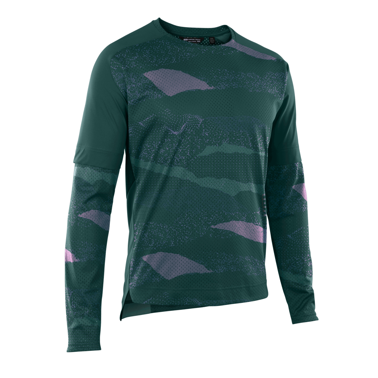The ION Scrub long-sleeve MTB jersey comes in a loose fit with a race-inspired breathable and durable fabric mix. The main body is recycled venting mesh fabric for breathability with Power Knit inserts on the most exposed areas. Power Knit is a recycled polyester/polyester mix that uses a special tight knitting technique, like woven fabric, so fibers are not easily snagged.